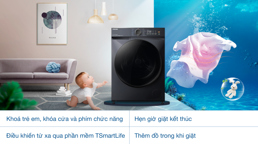 – Khóa trẻ em: hạn chế trẻ em nghịch phá, thao tác sai trên bảng điều khiển gây gián đoạn chương trình giặt, giúp tăng độ bền cho máy giặt.