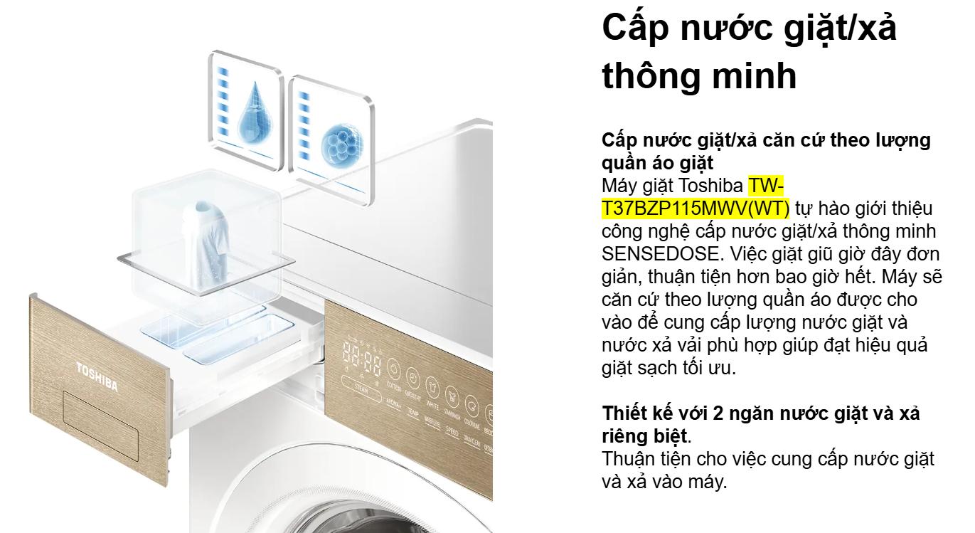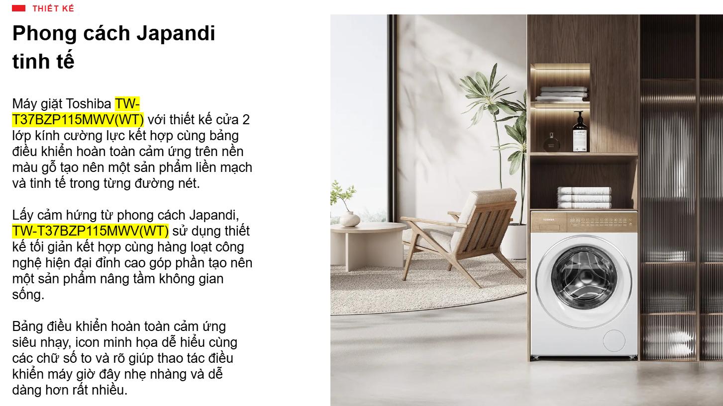 Máy giặt Toshiba Inverter 10.5 Kg TW-T37BZP115MWV(WT) lấy cảm hứng từ phong cách Japadi, máy giặt T37 được trang bị màn hình cảm ứng hoàn toàn trên nền bảng điều khiển màu gỗ hòa cùng thiết kế tối giản để mang đến một không giản sống thật hiện đại và tinh tế.
