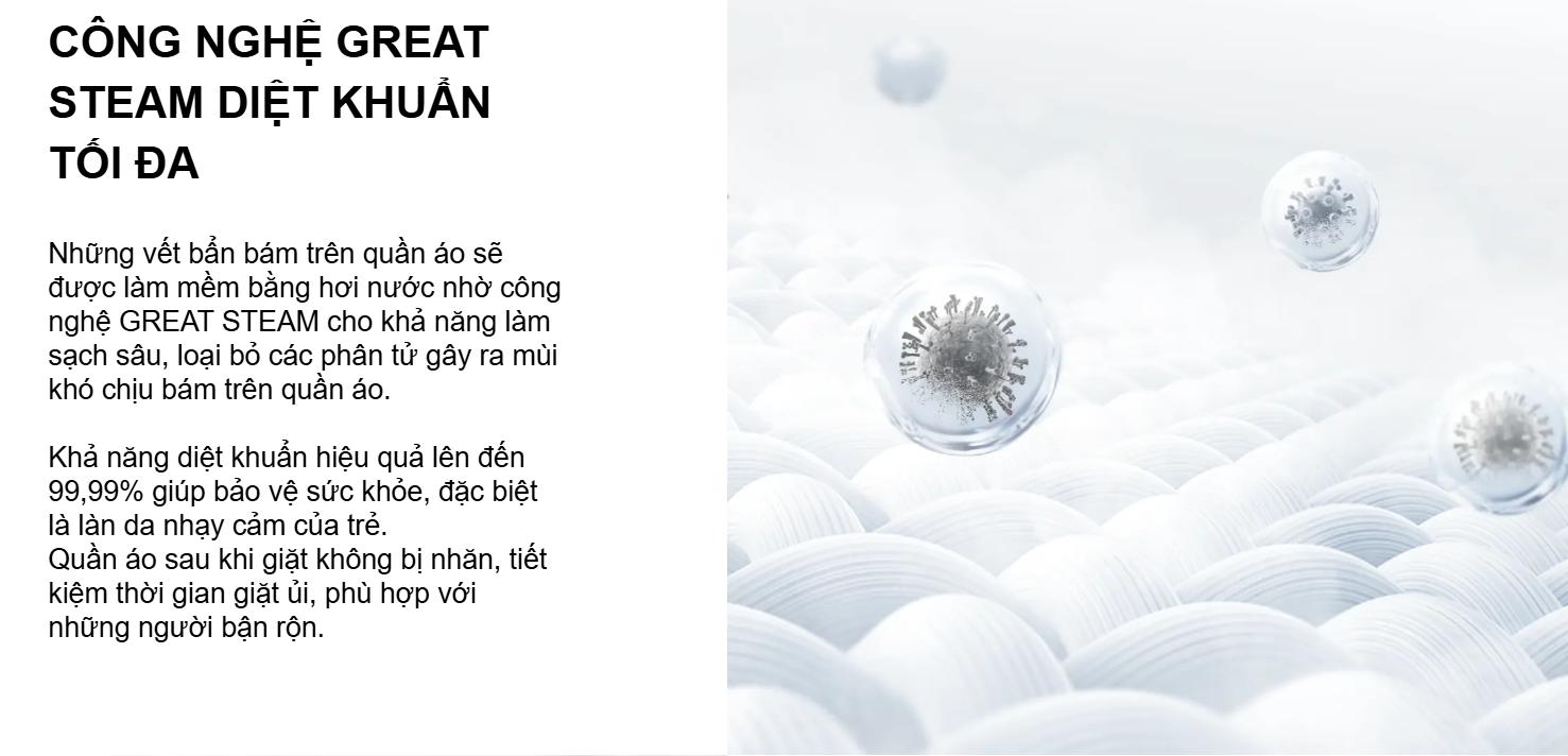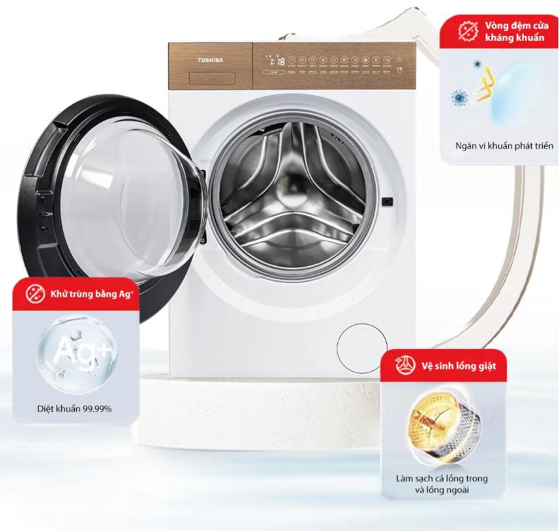 Các ion Ag+ được giải phóng từ lồng giặt khi tiếp xúc với nước đảm bảo khả năng diệt khuẩn lên đến 99,99%*