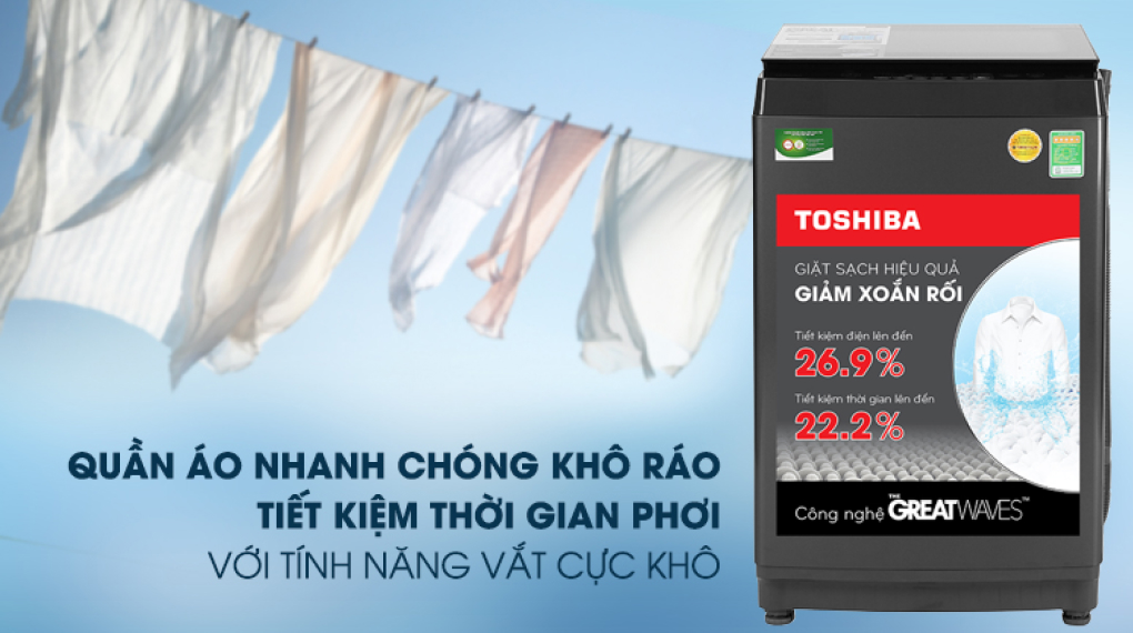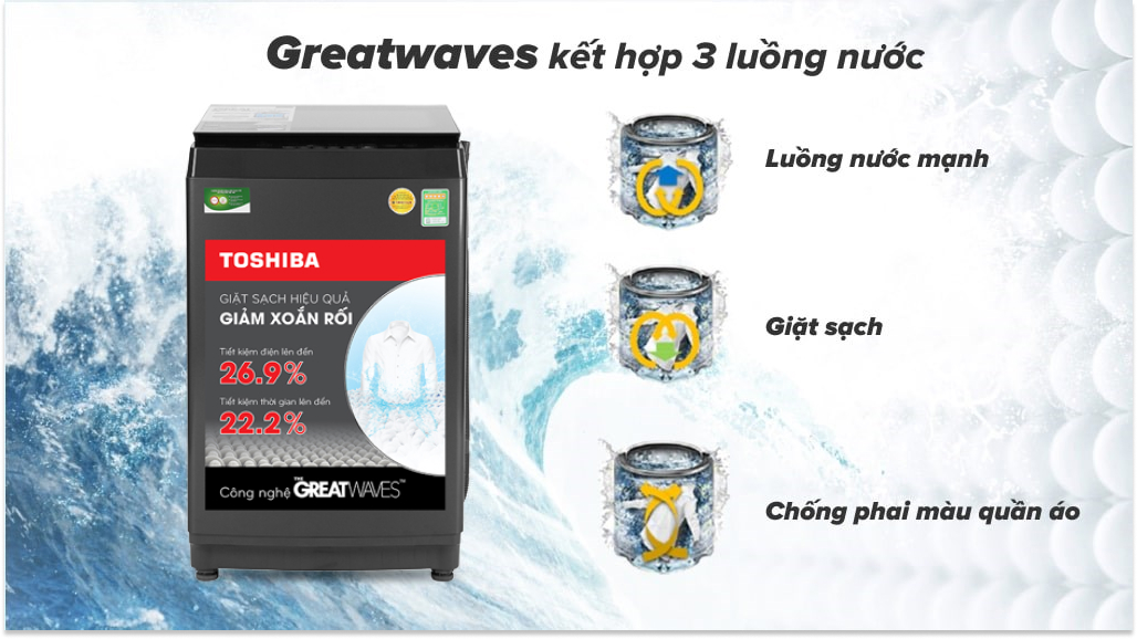 Công nghệ giặt Greatwaves trên máy giặt Toshiba Inverter kết hợp cùng hiệu ứng 3 luồng từ 3 hướng khác nhau tạo nên luồng nước siêu sóng giúp đánh bật mọi vết bẩn cứng đầu. Từ đó còn giảm được lượng nước và điện năng tiêu thụ, tiết kiệm chi phí hơn.