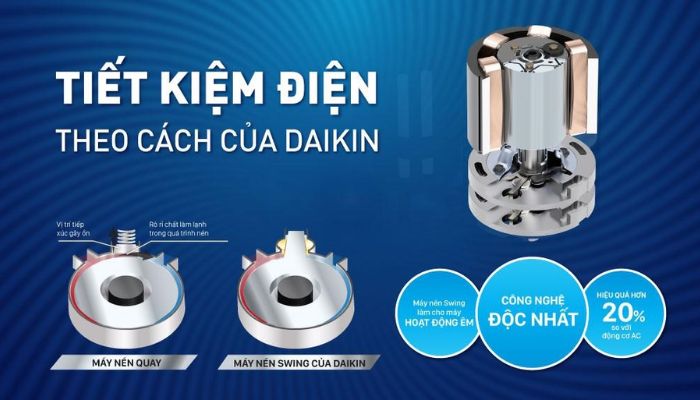 Công nghệ tiết kiệm điện với máy nén Swing độc quyền của Daikin mang đến hiệu năng vận hành vượt trội Công nghệ Streamer “Chuẩn lọc khí”