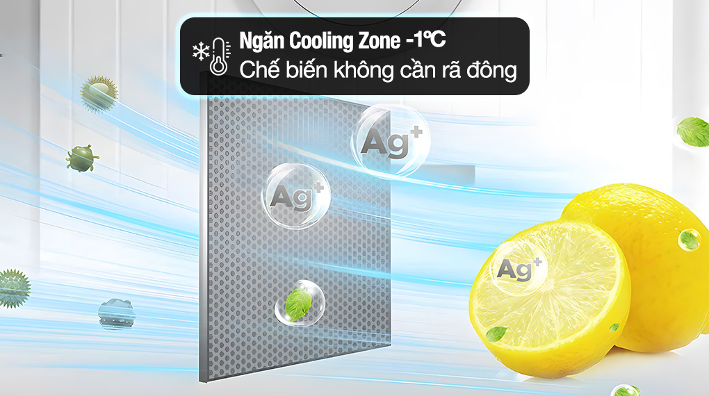 – Ngăn Cooling Zone -1°C: Cấp đông bề mặt thực phẩm tươi sống, giúp duy trì độ tươi ngon và chất dinh dưỡng. Khi cần, bạn có thể sử dụng ngay mà không cần rã đông. Ngoài ra, ngăn đông mềm -1°C Cooling Zone còn hỗ trợ bảo quản tốt các loại đồ uống, thực phẩm mềm (như phô mai, sữa chua,…).