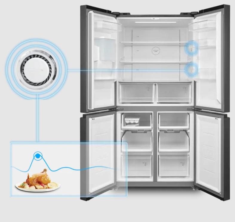 Không khí lạnh thổi từ cạnh sau tủ theo hình vòng cung sẽ lan tỏa đồng đều hơi lạnh đến mọi ngõ ngách, đảm bảo độ tươi ngon của thực phẩm lưu trữ.