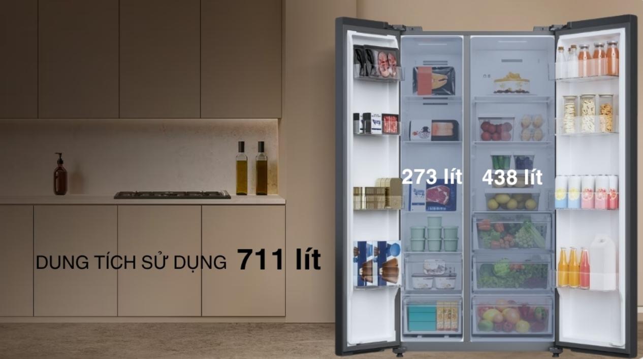 – Dung tích sử dụng lên đến 711 lít đáp ứng nhu cầu trữ thực phẩm của gia đình đông thành viên.