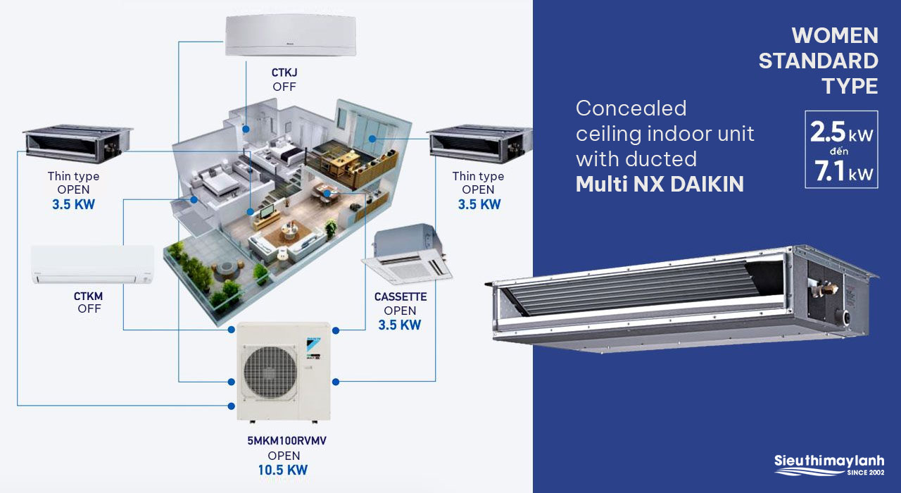 Daikin Multi NX duct connected indoor unit CDXM71RVMV inverter (3.0Hp) Gas R32 with low static pressure. This unit combines with both 1 & 2-way multi-unit outdoor unit, model 2018 station R32. Power 7.1kW combine with 1-way outdoor unit models 4MKM80RMVM, 5MKM100RMVM, and 2-way 4MXM80RMVM, 5MXM100RMVM. CDXM71 indoor unit is slim and compact, width 1100m, height 200m, suitable for installation in narrow ceilings with a depth of only 240mm. It is the model with the highest capacity in the standard low-static pressure duct-connected ceiling-mounted indoor unit. If you need a lower capacity indoor unit, please refer to Daikin's multi-air conditioner catalog.