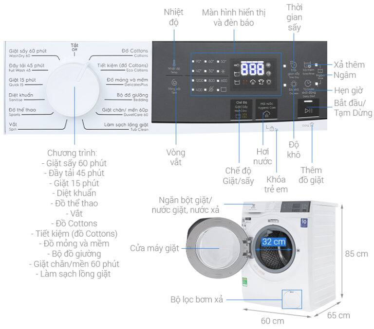 Máy giặt sấy Electrolux 9/6 kg EWW9024P3WC Diệt khuẩn đến 99,9% sau mỗi lần giặt