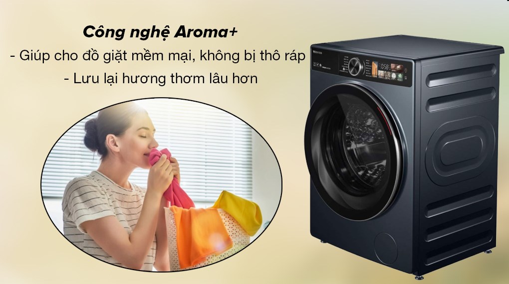 – Công nghệ giặt thơm, mềm mại Aroma+: Đây là công nghệ độc quyền của Toshiba, nó tự động điều chỉnh nhiệt độ nước, hòa tan nước xả vải hiệu quả và thời gian ngâm quần áo với nước xả, nhờ đó giúp cho đồ giặt được mềm mại, không bị thô ráp và lưu lại hương thơm lâu hơn.