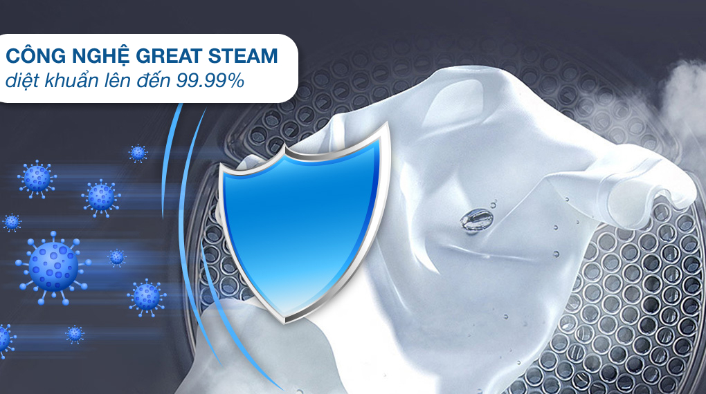 – Công nghệ Great Steam mang đến khả năng diệt khuẩn bám trên quần áo bằng cách sử dụng hơi nước nóng, đồng thời công nghệ này còn loại bỏ nhanh chóng các tác nhân gây dị ứng giúp bảo vệ làn da các thành viên trong gia đình bạn.