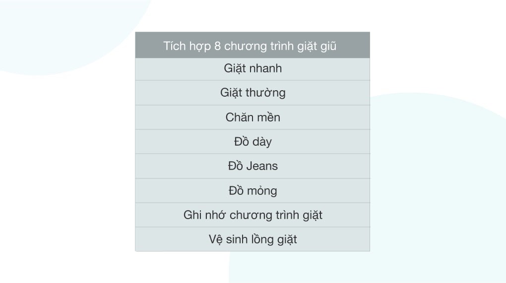 Bên cạnh đó, máy giặt được tích hợp sẵn 8 chương trình giặt (xem chi tiết tại bảng thông số kỹ thuật) bao gồm: Chăn mền, ghi nhớ chương trình giặt, giặt nhanh, giặt thường, vệ sinh lồng giặt, đồ dày, đồ Jeans, đồ mỏng. Với chương trình giặt chăn mền, bạn có thể dễ dàng giặt sạch những chiếc chăn một cách dễ dàng tại nhà mà ko cần mang ra tiệm giặt nữa.