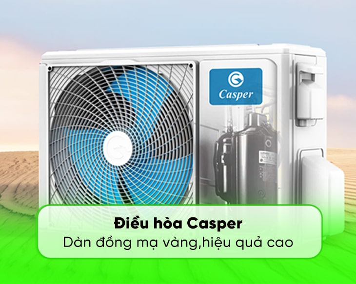 Tất cả các model điều hòa dân dụng Casper đều được trang bị dàn tản nhiệt đồng mạ vàng. Lớp mạ vàng giúp tăng khả năng chịu đựng các tác nhân ăn mòn như: Nước muối, mưa, các chất ăn mòn khác…, đẩy lùi sự sinh sôi của vi khuẩn và làm tăng hiệu năng trao đổi nhiệt cũng như tuổi thọ của sản phẩm.