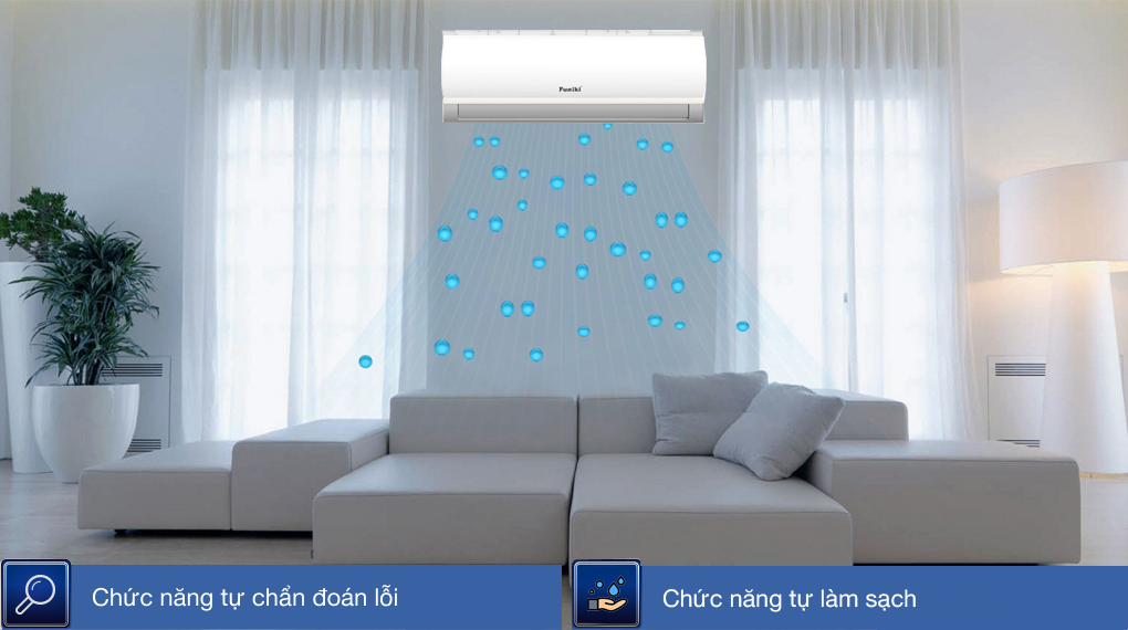 - Máy lạnh Funiki có cơ chế thổi gió tự động lên xuống và điều chỉnh bằng tay trái phải, giúp hơi lạnh dễ dàng lan tỏa khắp không gian phòng.