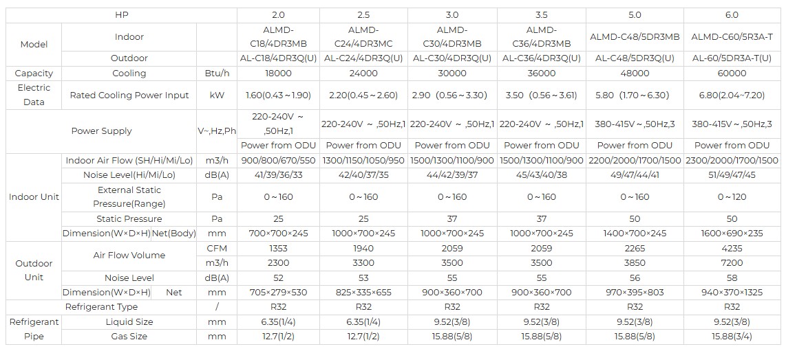 Thông số kỹ thuật máy lạnh giấu trần AUX M series