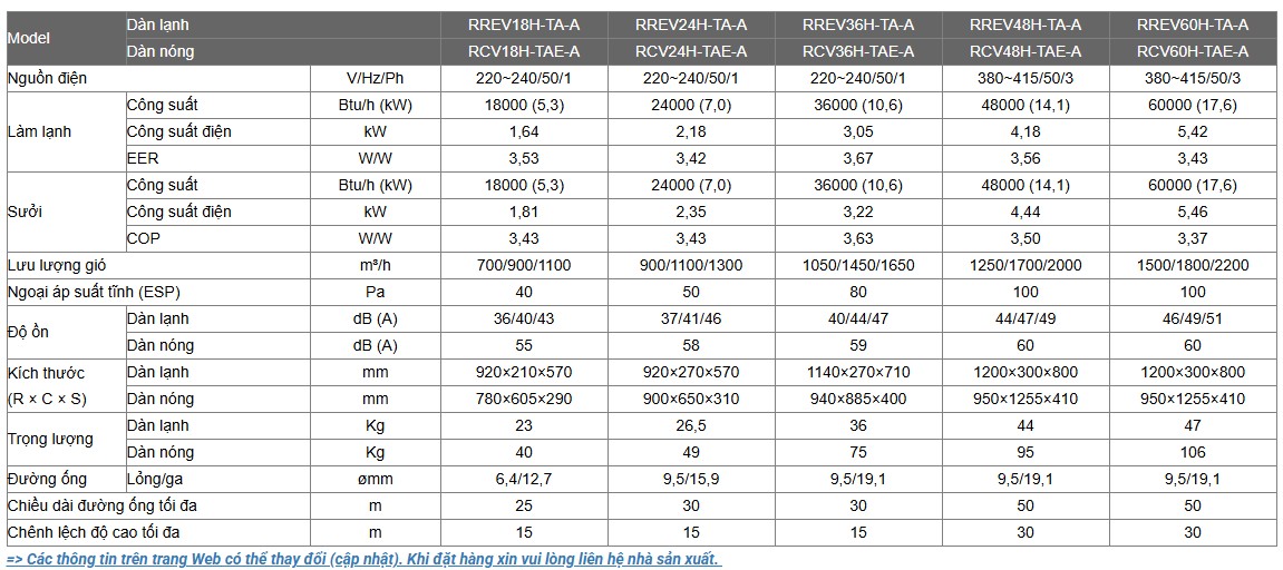 Thông số kỹ thuật dòng máy lạnh giấu trần inverter Reetech RREV