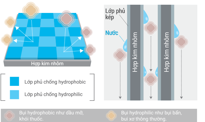 Công nghệ lớp phủ kép chống bám bẩn giúp ngăn ngừa tích tụ bụi bẩn, khói thuốc và dầu mỡ trên bề mặt giúp thiết bị luôn sạch Bộ lọc V-Air – Bảo vệ sức khỏe tối ưu