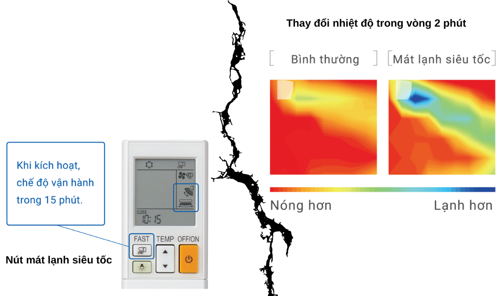 - Nhanh chóng làm lạnh phòng với luồng gió mạnh tối đa, nhiệt độ giảm nhanh chỉ sau khoảng 2 phút.