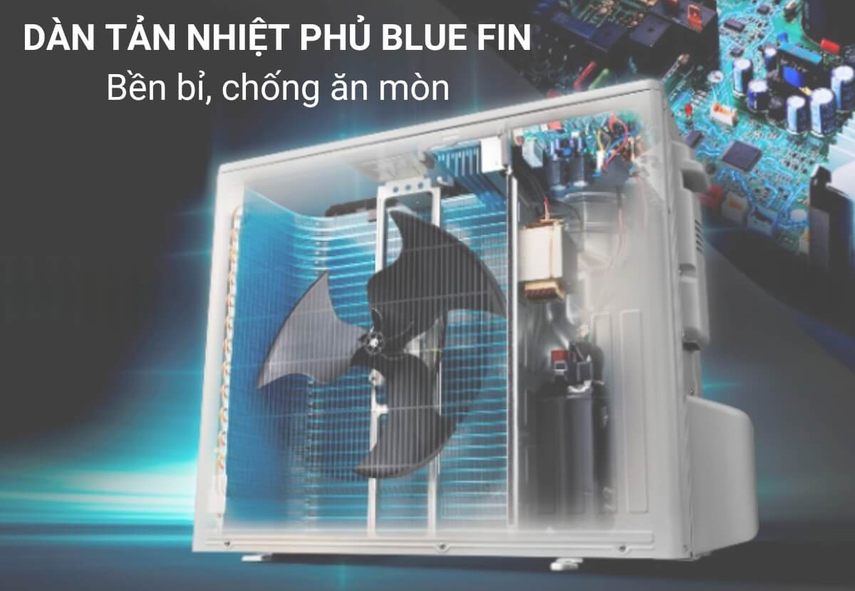 Dàn trao đổi nhiệt của máy được phủ lớp chống ăn mòn Blue Fin, giúp tăng cường khả năng chống gỉ sét, nâng cao tuổi thọ máy – nhất là khi sử dụng ở khu vực có khí hậu ẩm hoặc gần biển. Ngoài ra, bo mạch được thiết kế đặc biệt để chịu được điện áp cao tới 450V, kết hợp lớp phủ chống ẩm và chống côn trùng giúp máy hoạt động ổn định và bền bỉ hơn theo thời gian.