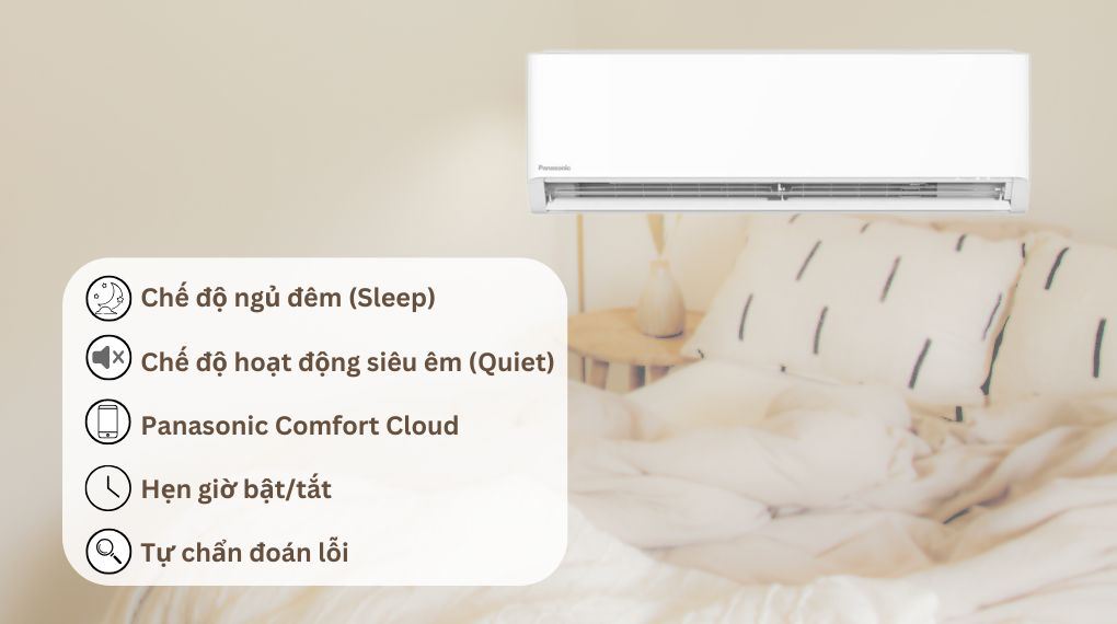 - Máy lạnh Panasonic Inverter sử dụng công nghệ biến tần, giúp điều chỉnh vòng quay máy nén để duy trì nhiệt độ ổn định, mang lại cảm giác dễ chịu cho người dùng. Bên cạnh đó, nhờ việc điều chỉnh vòng quay máy nén thay vì tắt/bật đột ngột, máy vận hành êm ái, hạn chế tiếng ồn, giúp gia đình có giấc ngủ ngon và không bị ảnh hưởng đến sinh hoạt hằng ngày.