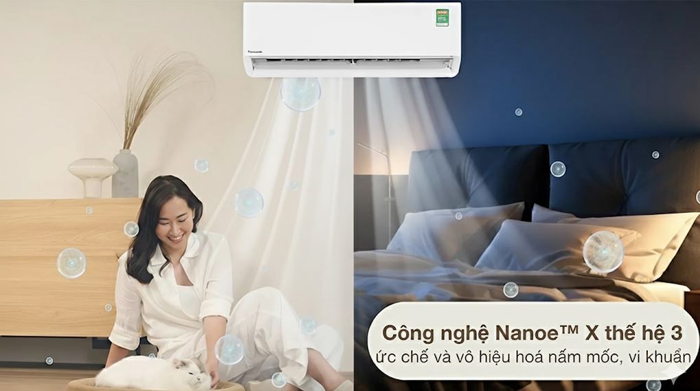 - Công nghệ Nanoe™ X thế hệ 3 ức chế vi khuẩn, nấm mốc và khử mùi hiệu quả bằng cách giải phóng hàng loạt gốc OH- tự do, phá vỡ cấu trúc của các chất gây ô nhiễm, tối ưu hiệu quả khử mùi và ức chế vi khuẩn, nấm mốc hơn so với thế hệ trước đó. Ngoài ra, công nghệ này còn giúp duy trì độ ẩm trên da và tóc, mang đến không gian sống trong lành và thoải mái.