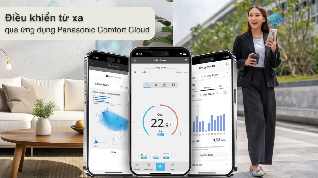 - Người dùng có thể điều khiển máy lạnh từ xa dù ở bất cứ đâu thông qua ứng dụng Panasonic Comfort Cloud trên điện thoại có kết nối wifi.
