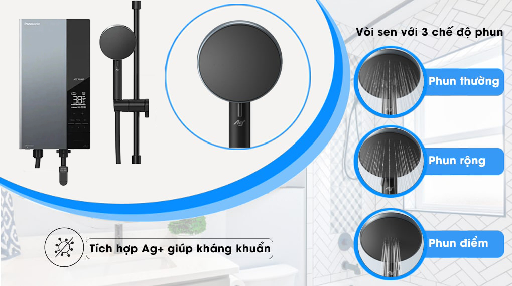 Máy nước nóng Panasonic này trang bị vòi sen 3 chế độ phun: thông thường, phun rộng và phun điểm để tùy chỉnh theo nhu cầu hoặc đối tượng người dùng. Đặc biệt, nhờ công nghệ tích hợp Ag+ kháng khuẩn mà nguồn nước sử dụng từ vòi sen trở nên sạch hơn, an toàn hơn, bảo vệ sức khỏe gia đình.
