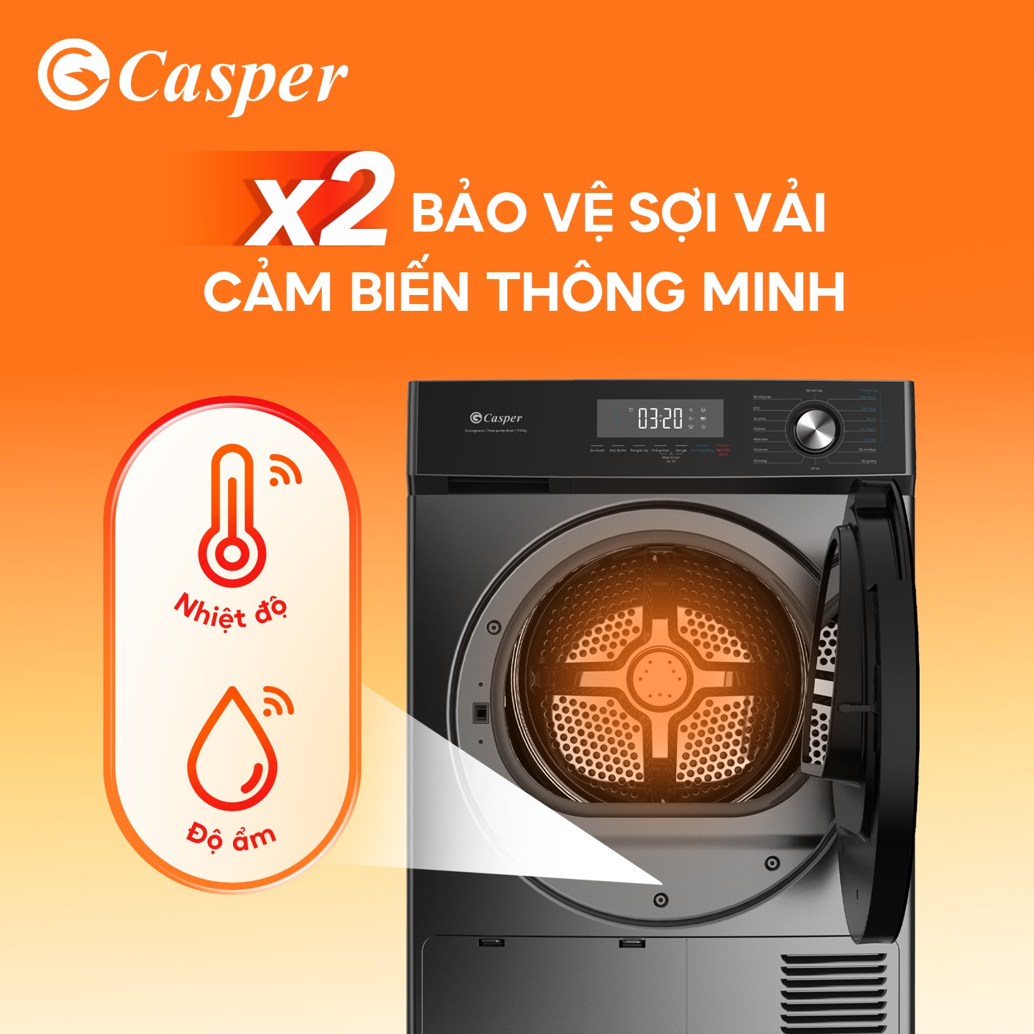 Máy sấy bơm nhiệt Casper thế hệ mới với Công nghệ sấy bơm nhiệt Heat Pump - sấy khô hiệu quả ở nhiệt độ thấp chỉ từ 45°C - mức nhiệt tương tự ánh nắng tự nhiên, làm giảm sức nóng gây hại cho sợi vải, kéo dài “tuổi thọ” quần áo.