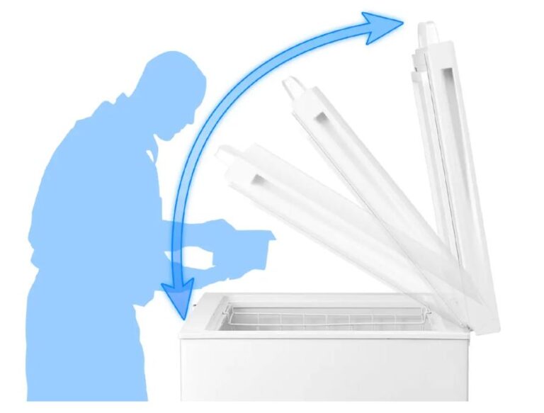 Nắp của Tủ đông TOSHIBA GR-RC390CM có thể nâng ở nhiều góc độ, giúp người dùng dễ dàng lấy nguyên liệu mà không cần phải dùng tay hỗ trợ, mang lại sự tiện lợi trong quá trình sử dụng.