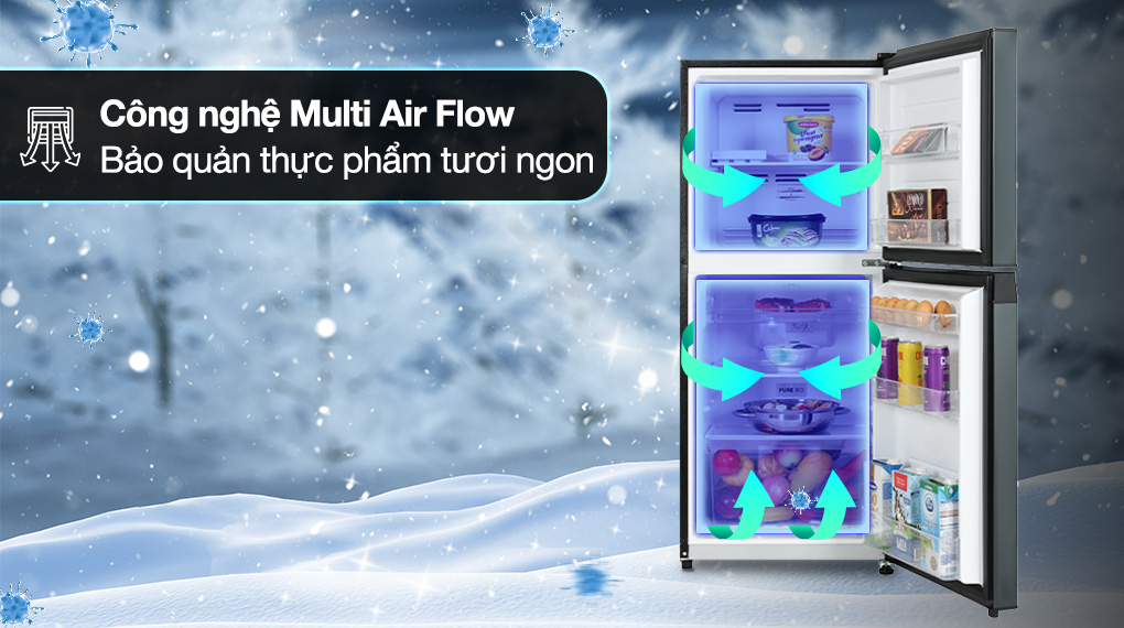 – Công nghệ Multi Air Flow: luân chuyển, phân bổ luồng hơi lạnh trải rộng đến mọi ngóc ngách để thực phẩm được làm lạnh toàn diện, hạn chế tình trạng làm lạnh không đồng đều, nâng cao hiệu quả bảo quản thực phẩm.