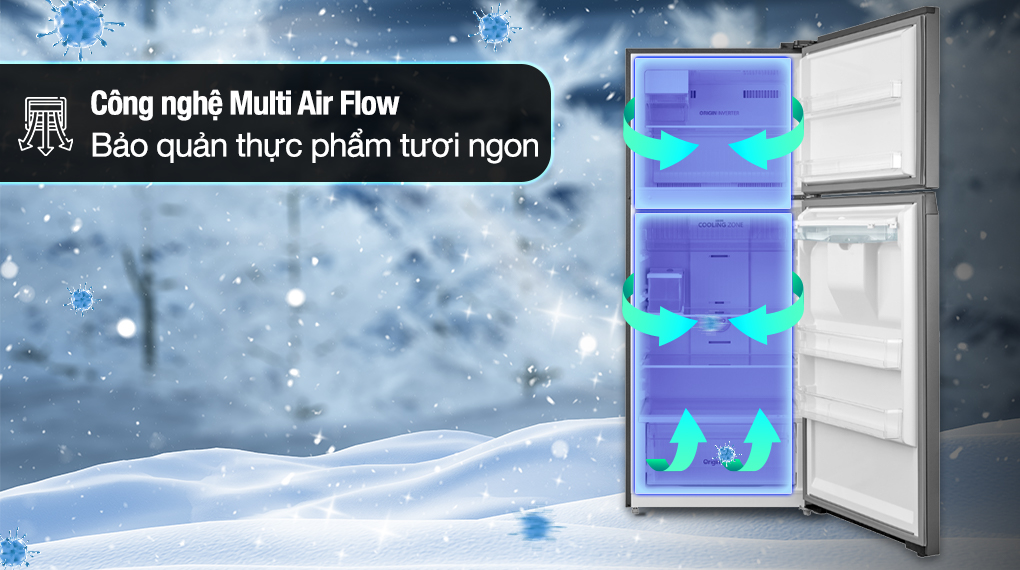 – Công nghệ Multi Air Flow: Mang khí lạnh vừa đủ đến mọi ngóc ngách bên trong tủ, giúp duy trì độ tươi ngon của thực phẩm tối ưu dù bạn đặt chúng ở bất kỳ vị trí nào bên trong tủ lạnh.